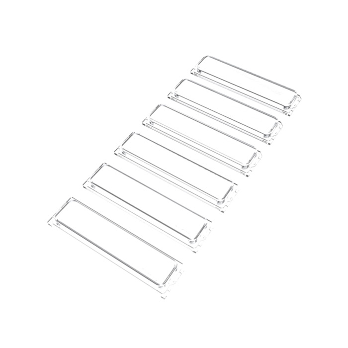 6 одинарных кнопок с именной табличкой. В комплекте с основанием и внешним защитным элементом из прозрачного УФ-стойкого поликарбоната. Размер именной бейджика 72 x 14 мм. Упаковка 6 шт.